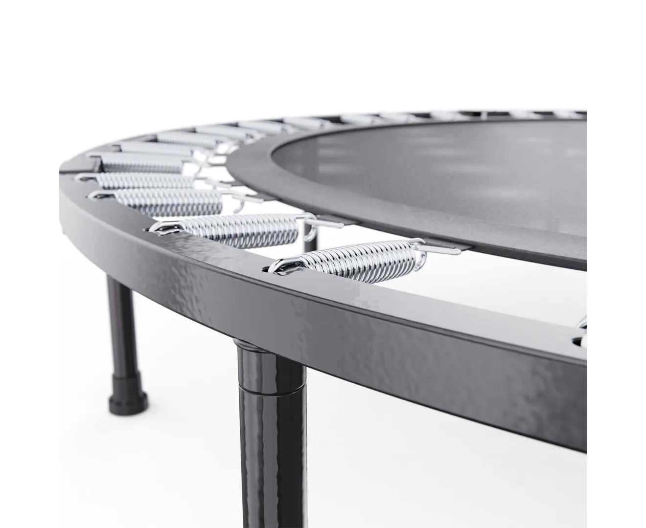 Рама из металла, основная труба 25 мм с толщиной стенки 1,2 мм. Ножек восемь, каждая 25 мм и 1,5 мм — стоят устойчиво, не шатаются. Пружин 36 штук, дают равномерный вылет и мягкость. Прыжковое полотно из полипропилена, плотное, не вытягивается со временем.
