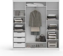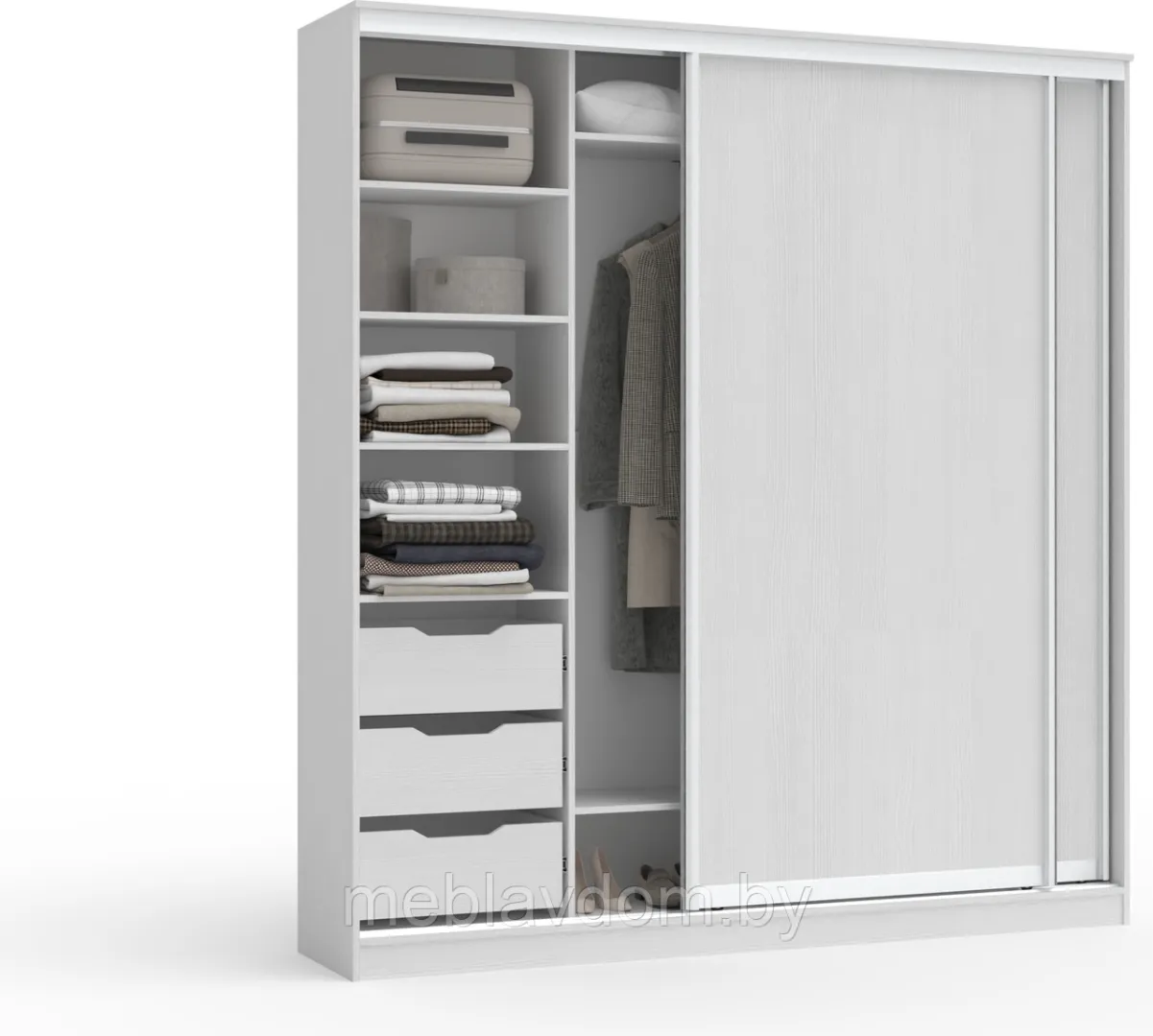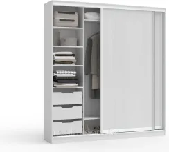 За раздвижными дверями находятся три секции и шуфлядный блок. Средняя секция оборудована выдвижной штангой для хранения одежды на плечиках, нижней полкой и антресолью. В левой части расположены 3 съёмные полки и 3 выдвижных ящика, в правой части - 4 съёмные полки.