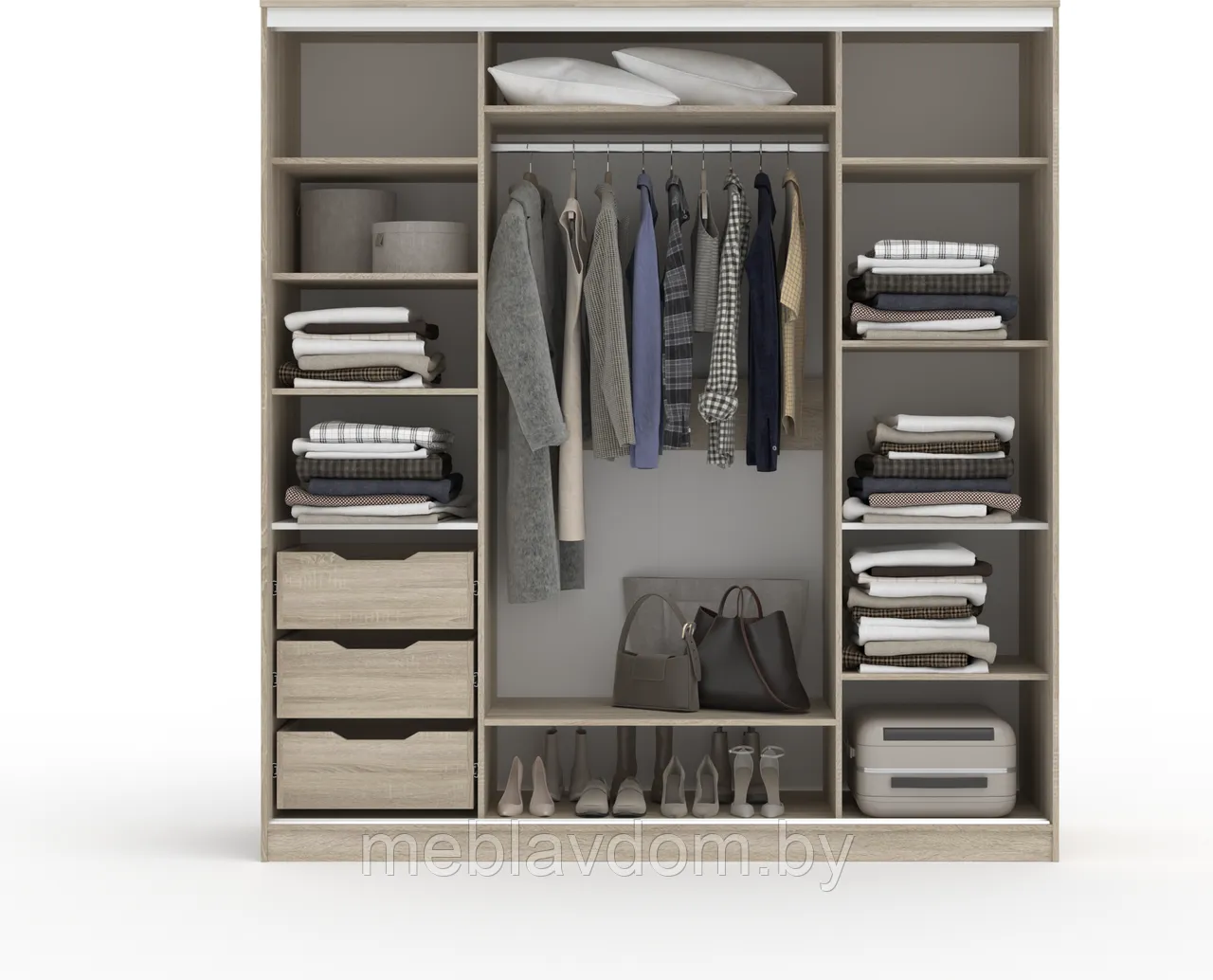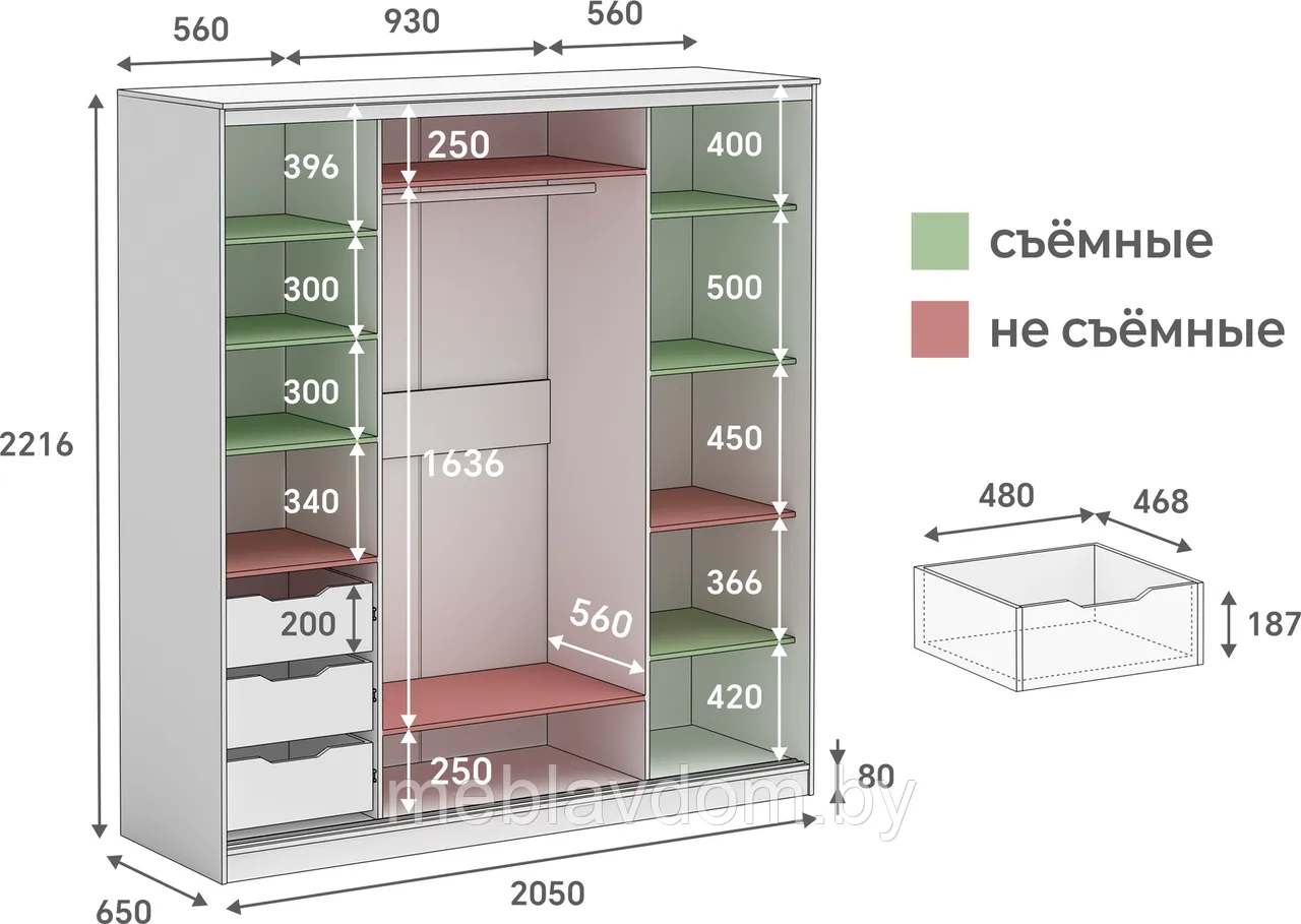 Стандартная глубина 65 см позволяет свободно вешать одежду на плечиках и открывать двери, а съёмные полки создают место для крупных вещей, таких как одеяла, пледы и постельное бельё.